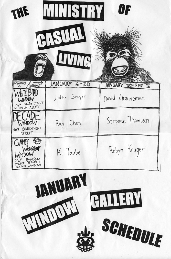 January DOWN TOWN window schedule Sun. January 1st 2012 - Tue. January 31st 2012 @ MOCL Window Projects (All Ages) Presented by: The Ministry of Casual Living