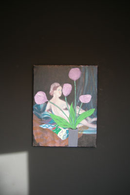 In the window of Ministry of Casual Living, between the dates October 2nd and 22nd, a new painting for every day of the exhibition This And Then This And Then This But Not This Or This will be brightly lit and visible from the street. The small portrait-oriented canvases, each painted in a day, begin with a ground zero (en francais?) Ingres-inspired reclining nude behind a floral still life and move through landscape, pattern, color, shape, painting-as-window motif, curtain and smoke as ‘cone’ motif, portrait as arte povera experiment, ejaculatory, expressive reconsideration, decorative question, stylization, collage, bocconcini sandwich-like, material-as-subject, artist searching for a suitable subject, towards abstraction, towards trompe l’oeil, towards a lie, towards truth, away from irony, towards sincerity, towards a heightened irony and then back again, towards unmitigated failure possibility.