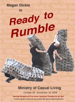 Ready to Rumble turns the austerity of architecture into a flaccid opponent. The installation consists of a floor to ceiling interactive sculpture and a continuously looped video. Witness the wrestling match between the artist and the wax brick sculpture as it hovers between intimacy and aggression. Experience the feeling of caressing Victoria’s brick walls as a metaphor for desire, competition and possession.