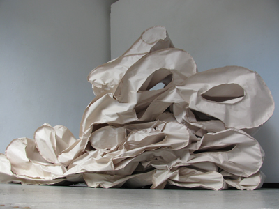 uht-er nonsense is an on-going exploration using the nonsense sound/word, jee; one of a set of nonsensical, inarticulate utterances meant to convey a sense of bewilderment. Scale, gravity and paper, paper being a versatile material with associations of fragility and impermanence, as well as, persistence and infinite possibilities, contribute to the exaggerated transition of an object from one state to another. The stacked, paper sound/word, jee, expressed as an absurd novelty item, is intended to elicit desire while questioning notions of value around identity and sustainability.