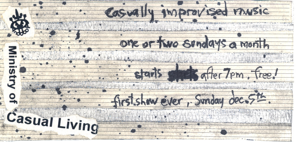 Casually Improvised Music Sun. December 5th 2004 @ 7pmOne or two sundays a month! FREE! First show ever, Dec. 5th, 2004Presented by: The Ministry of Casual Living