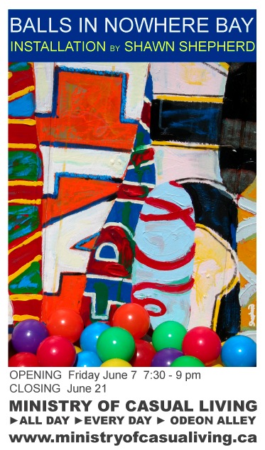 Shawn Shepherd : Balls In Nowhere Bay Fri. June 7th 2013 - Fri. June 21st 2013 @ Ministry of Casual Living Window Gallery (All Ages) A mixed-media installation by Shawn Shepherd. Curated by: Cameron KiddPresented by: The Ministry of Casual Living