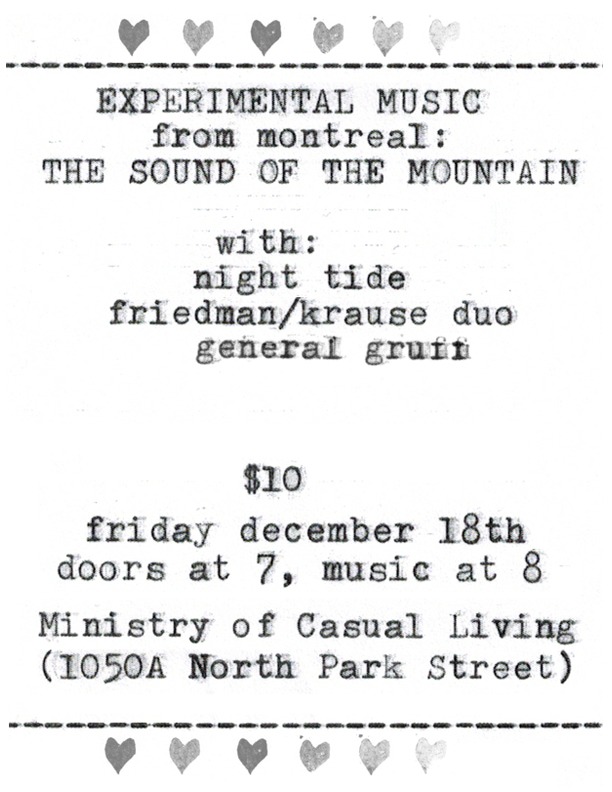 Join Craig Pedersen on his CUT AND GOUGE solo-trumpet cross-Canada CD-release tour on Friday, December 18th at the Ministry of Casual Living. At each stop of the tour he’ll be playing with some of the musicians he loves - in this case, Night Tide (Soma Morse), General Gruff (Adam Cantor) and the Friedman/Krause duo and with his project The Sound of the Mountain with Montréal’s Elizabeth Millar.. More information about the tour and the new disc at http://www.craigpedersen.com