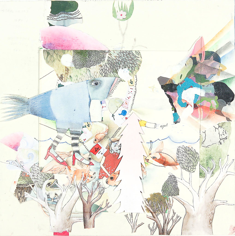 An exhibition of collages that created from an archive of artworks dating back to 1994. The works include watercolour characters and paper landscapes from a book and a stop-motion animation set, cutouts of abstract studies, etchings, scraps of drawings, a colour wheel from design class in first year of art school and more.