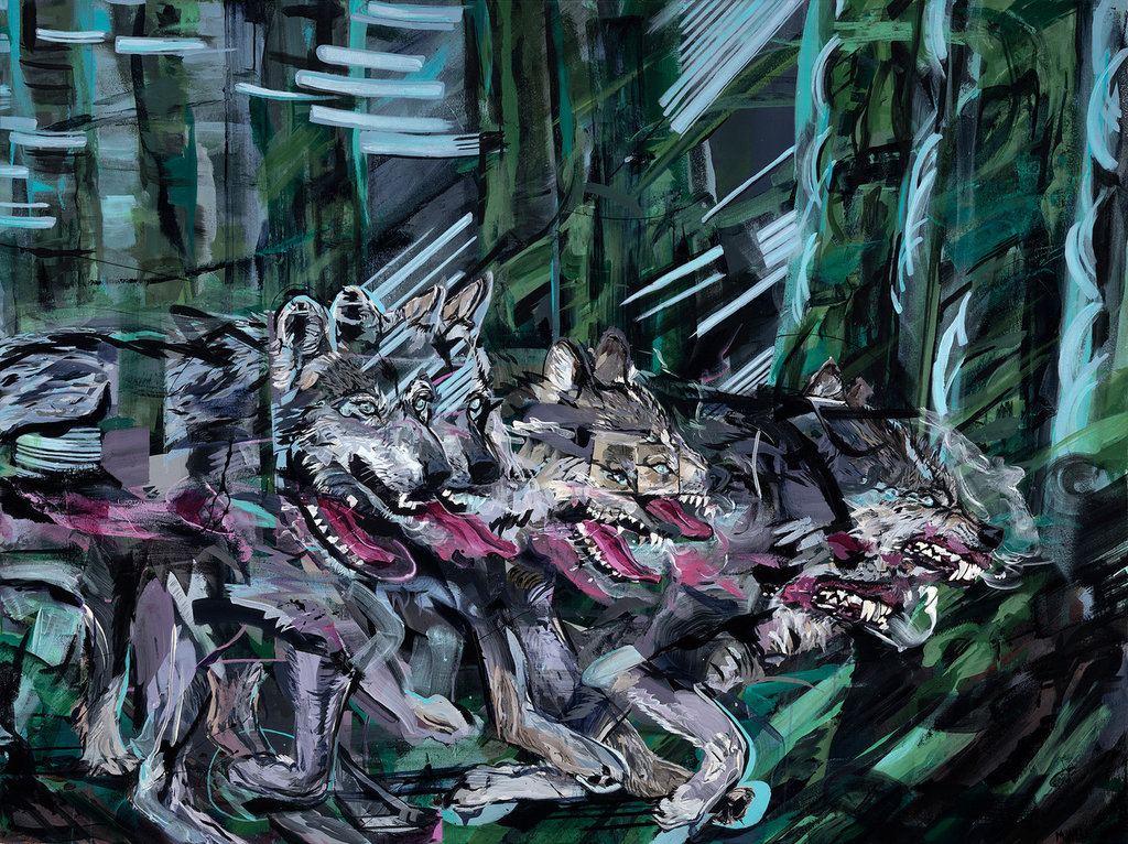 Mitchell Villa's process follows movement, while his brush stroke reflects his subjects in motion. Villa works in layers, applying, reapplying, and distorting. Sections of the canvas seem like spliced film frames, while others imply motion blur, collage, trace-lines, smudge, and saturation among their emotive effects. Villa challenges the single moment usually reflected in a two dimensional composition. His figures seem to move through time and out from the frame. Their energy is amplified by his large scale and bold colours, which draw the viewer inside. One can stand well under the top of the frame, and pace from one side to the other, following the movement and its sense of rhythm, as one would with music or dance.
