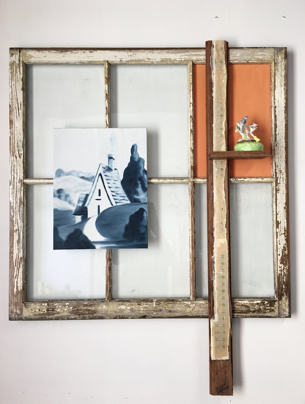 “Sweet Dreams” is a composite of sculpture, painting and found objects; a small painting of an idyllic home floating on a discarded window holding a remnant of domestic kitsch. The work is from a recent series considering cultural detritus; objects of kitsch and other decorative elements left in basements and thrift stores once cherished but now forgotten. Combining painting with craft, kitsch and architecture allows for a less didactic reading of the work, hopefully offering an open narrative rather than furthering tired discourse around high and low forms of art.