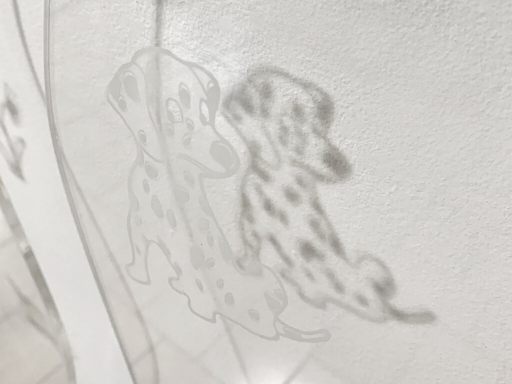 Growing up, my mom would doodle on scrap paper while she chatted on the phone. I would doodle in the margins of my notepad during class. Assignments would come back with stickers for a job well done. Glittery, girlish stickers would adorn my bedroom vanity mirror and the backseat car windows. This piece relays these scraps, mementos, and markers for a mind in other places in the form of laser etched acrylic panel. Like apparitions, these motifs shift in perceptibility depending on the environmental light, which causes the strength of the shadows they cast to continually change. Imagery of howling hounds, butterflies, flowers, scribbles and squiggles feature prominently, pointing to a whimsical, ephemeral and escapist vision for a childhood me (and a younger you, too?).